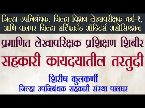 ज़िल्हा उपनिबंधक, सहकारी संस्था, पालघर तसेच ज़िल्हा विशेष लेखापरीक्षक वर्ग - १, उपनिबंधक कार्यालय (सर्व ) आणि पालघर सर्टिफाईड असोसिएशन यांच्या संयुक्त विद्यमाने दि. २० जून २०२४ आयोजित प्रमाणित लेखापरीक्षक प्रशिक्षण शिबीर. विषय : सहकारी कायदयातील तरतुद, वक्ते : शिरीष कुलकर्णी, ज़िल्हा उपनिबंधक, सहकारी संस्था, पालघर